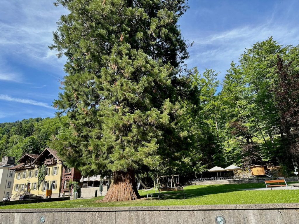 Der riesige Mammutbaum (eine Zypresse) wird als Naturdenkmal bestaunt, die Mohren Weisse vom Fass in der Sonne getrunken – Start gelungen, alle glücklich!