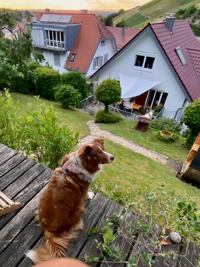 Der Sonnenuntergang hinter den Vogesen begeistert nur uns, Flora interessiert sich eher für die Hauskatze, die ist „not amused“…