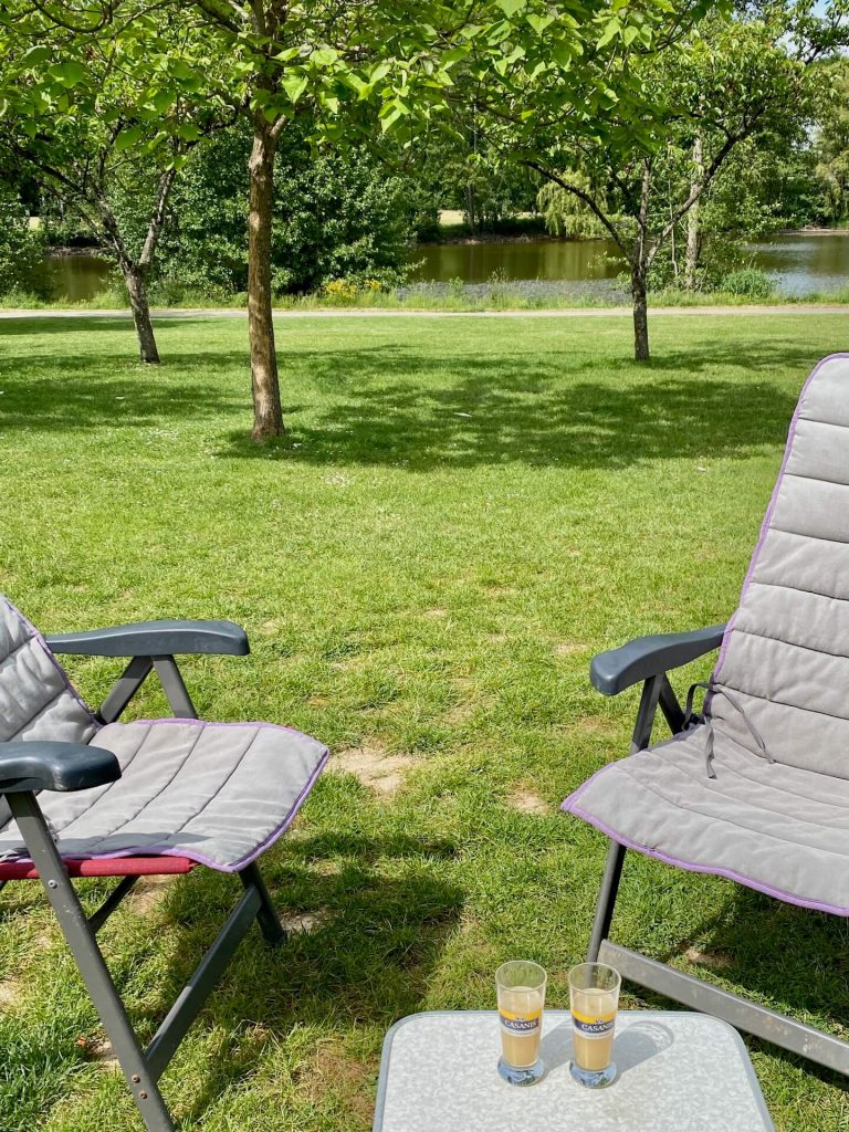 Kurz vor der Stadt Luxemburg reicht es für heute, bei dem idyllischen Weiher Kockelscheuer gibt es viele P, natürlich auch einen für uns, erste Reihe fußfrei beim Wasser. Da muss jetzt endlich der erste Pastis her, wir haben vorgesorgt.