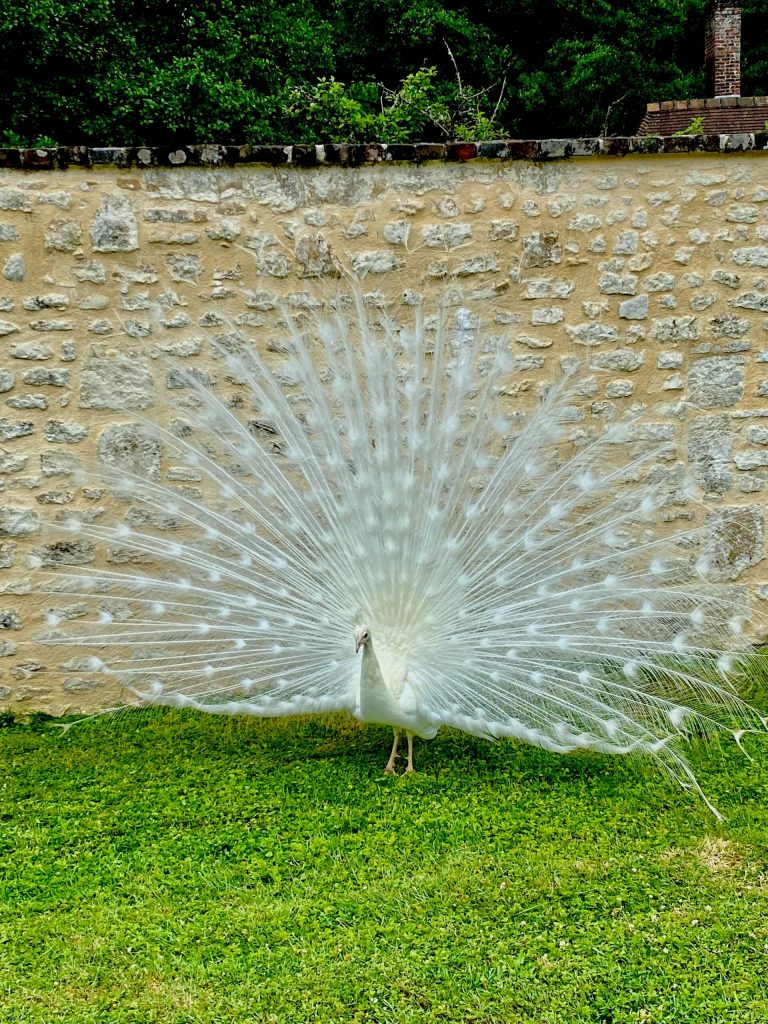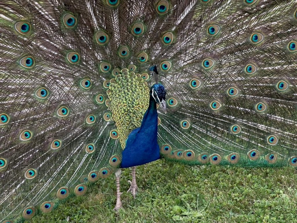 Perfekt zum Ambiente passen die 3 Pfaue, sie verleihen dem Garten etwas exotisches und präsentieren stolz ihr prächtiges Gefieder.