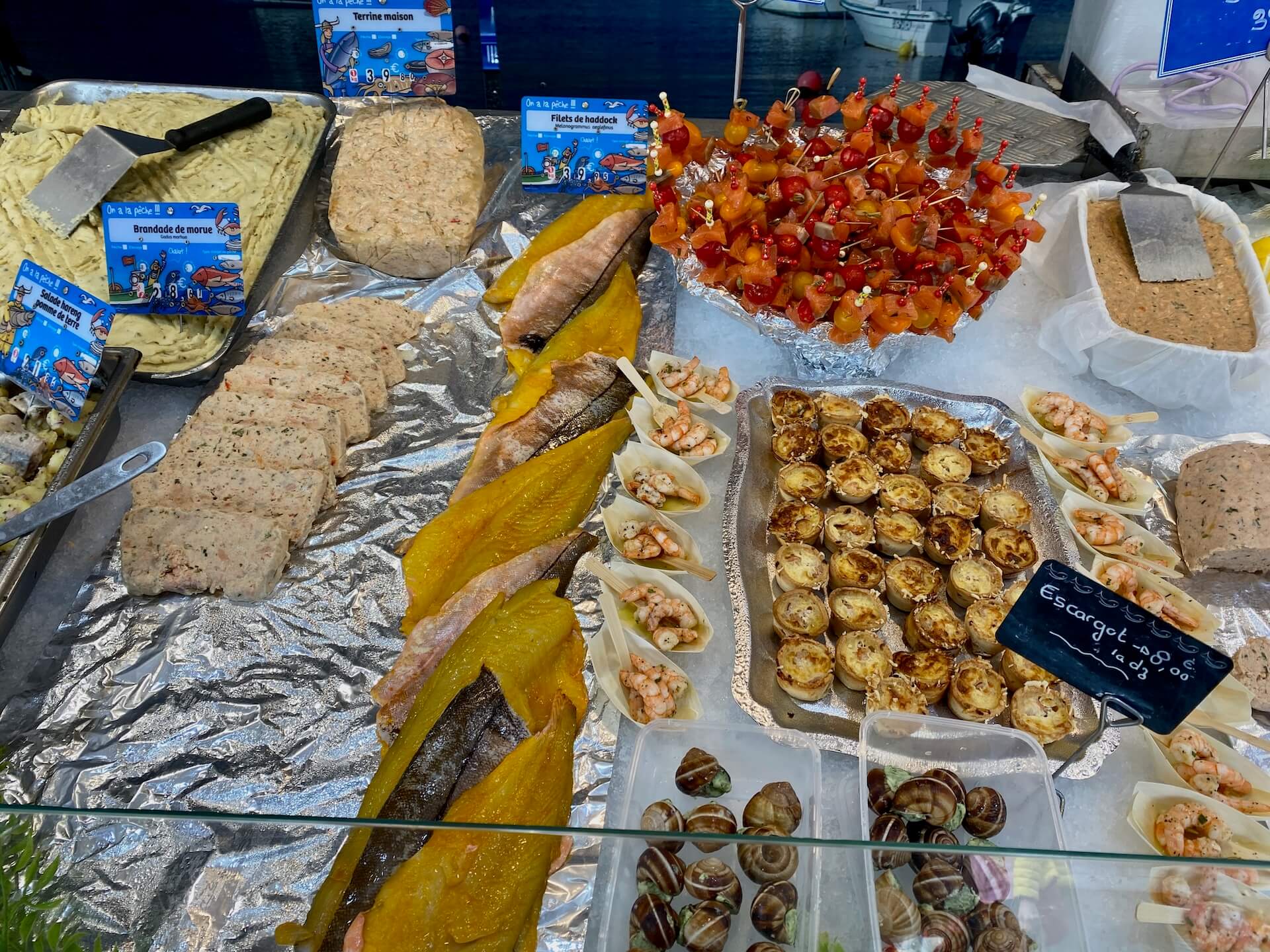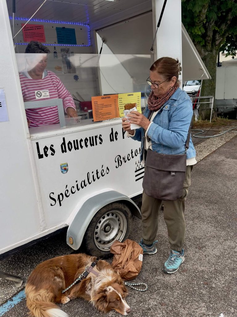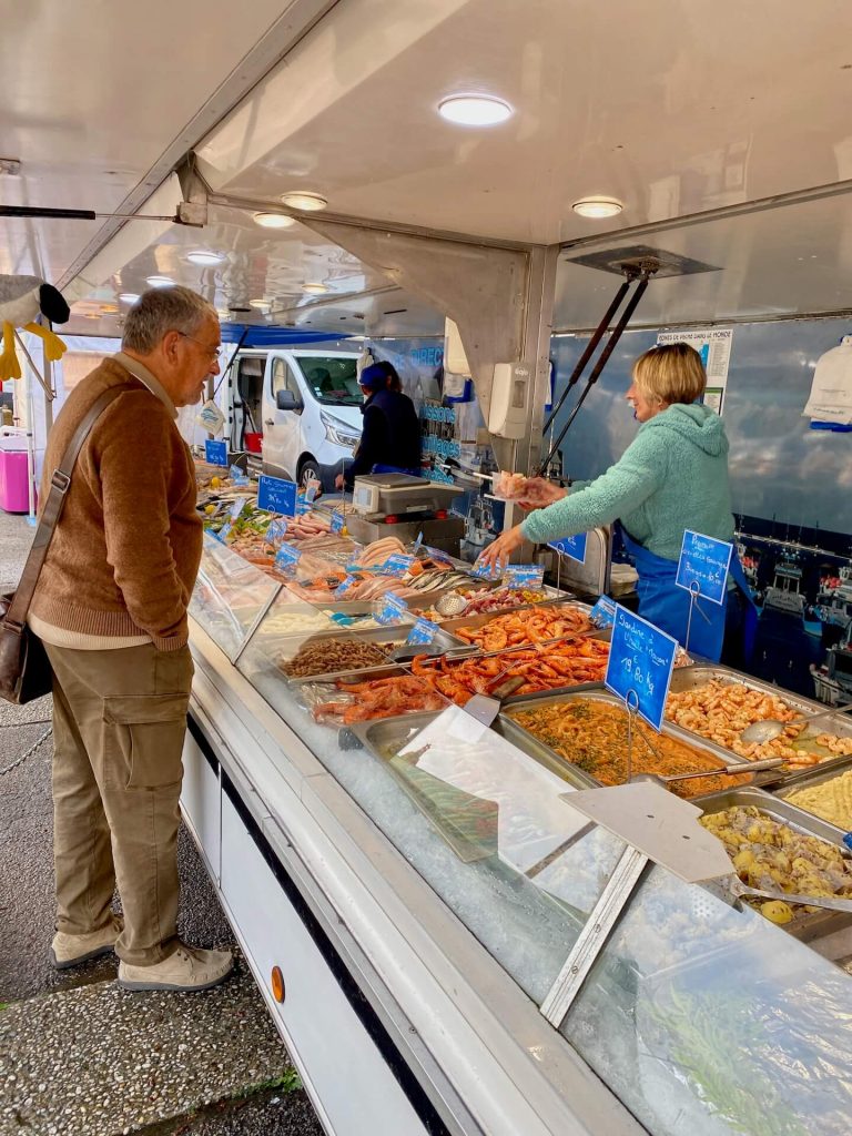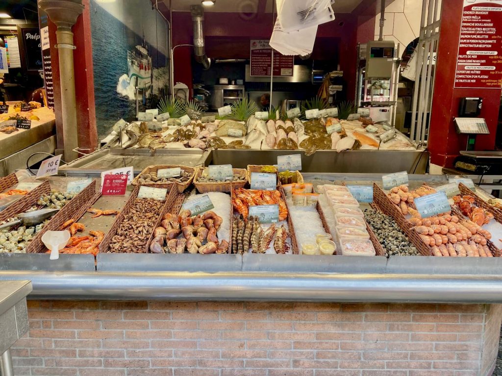 Am Fischstand sind wir wiedereinmal baff was hier angeboten wird, natürlich wird eingekauft: terrine de poisson, filet d’espadon, crevettes….ja, die Fr. Google leistet mir dabei gute Dienste. Nicht dass ich am Ende unwissend eine Terrine mit Gänsestopfleber kaufe.