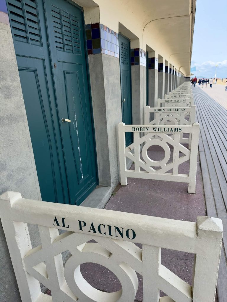 Weit gefehlt! Bis wir einen P finden ist es schon fast Mittag, wir starten gleich zum berühmten Sandstrand von Deuville mit den planches, den Planken aus tropischen Hölzern, wo bei den Umkleidekabinen am Strand die Stars verewigt wurden, die Deauville beehrt haben. Und das waren offenbar viele. Ob sie tatsächlich alle hier waren wagen wir zu bezweifeln, zumindest hat Coco Chanel nachweislich hier bereits 1913 einen Laden eröffnet und bestimmt auch gebadet.