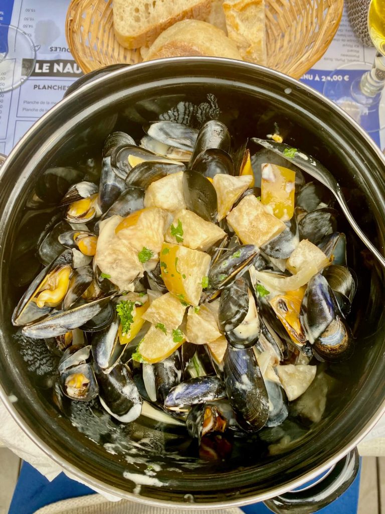 Die Moules werden hier überall in so einem Topf serviert – in den Deckel kommen dann die leeren Muschelschalen hinein. Ich habe so lange gesucht, bis ich ein Geschäft mit dem Moulestopf gefunden hab und gleich 2 gekauft! So stilecht wollen wir künftig auch unsere Muscheln servieren. Wolfgang grübelt schon über das Rezept…