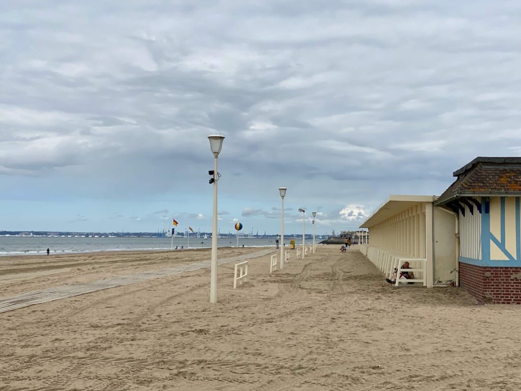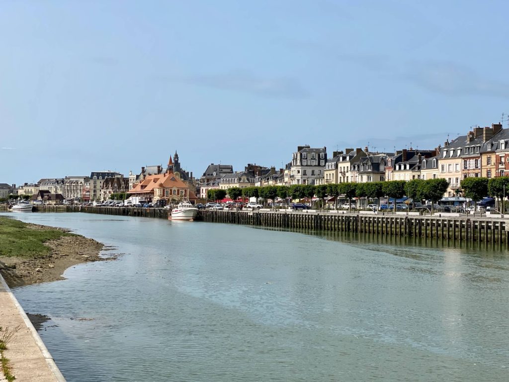 Es gibt eine kleine Personenfähre über den Fluss hinüber nach Deauville, auch die ist heute leider nicht in Betrieb. Der Fußmarsch bis zur Brücke ist uns zu weit, daher fahren wir weiter – Deauville werden wir später noch besuchen. Wenn dann das Wetter sonnig ist, wirkt bestimmt alles viel ansprechender und belebter.