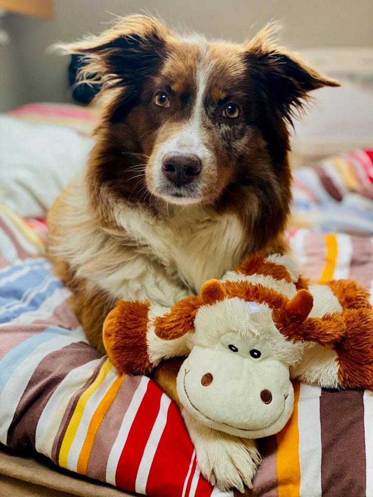 Flora bekommt als Belohnung für die lange Wartezeit eine nicht ganz originale Camembert-Kuh – weil ohne Brille – schließlich ist Flora ein „chien à lunettes“ 😉