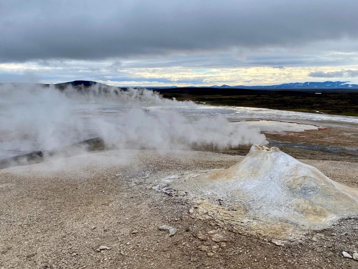 Schon von Weitem sieht man es rauchen und dampfen. Die Solfatarenfelder im Geothermalgebiet von Hveravellir sind atemberaubend – im wahrsten Sinne des Wortes, es stinkt penetrant nach Schwefel.