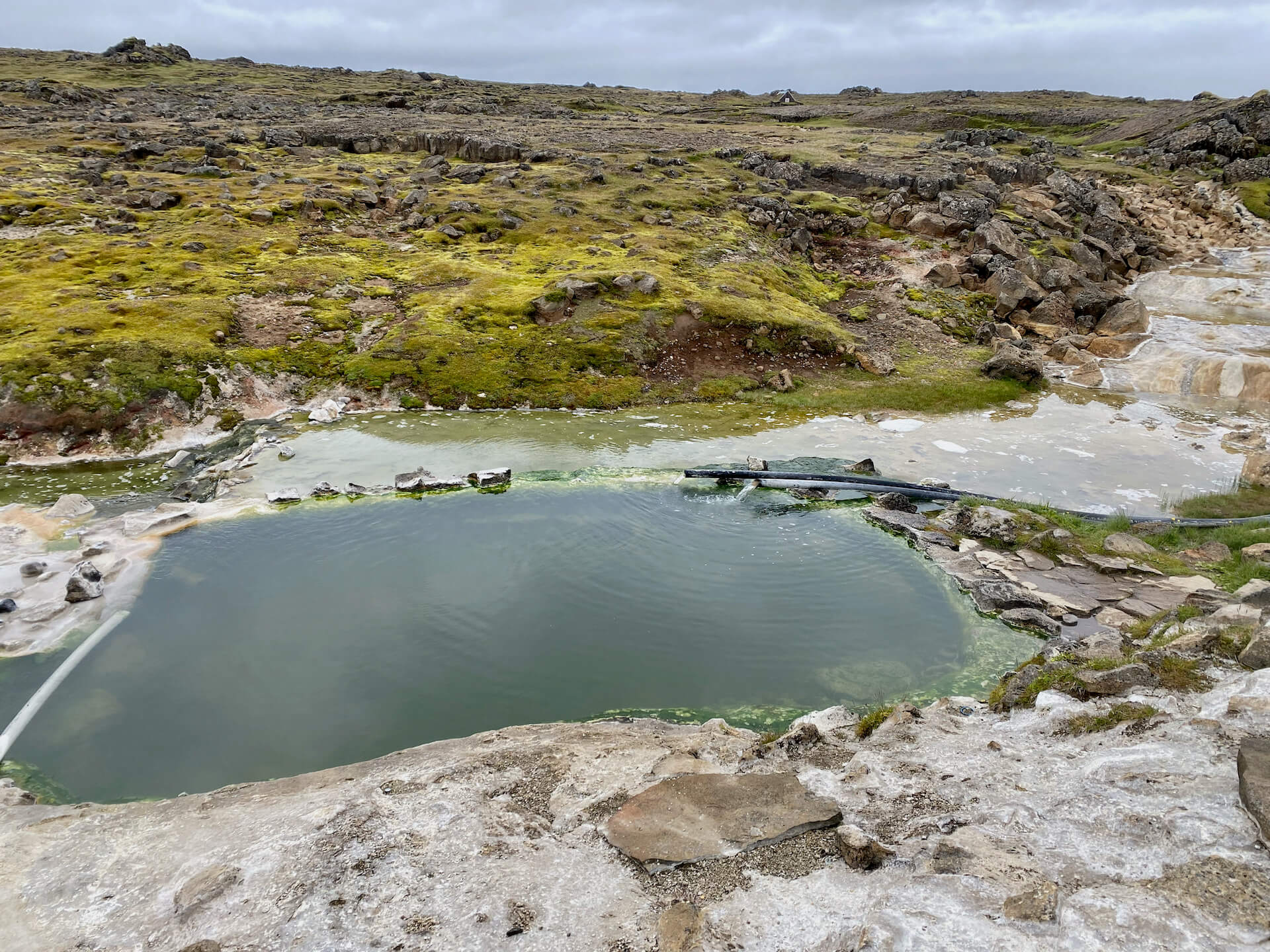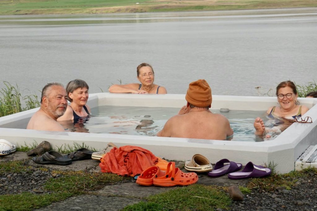 Es geht auf Nachtplatzsuche und kurz vor Hvammstangi werden wir fündig. Der „faule Eier-Gestank“ verrät uns, hier gibt es heiße Quellen, also hoffen wir auf einen Hot Pot mit Meerblick. Ja, der liegt gleich neben dem schönen Aufenthaltsraum, wir nehmen das alles gerne in Anspruch.