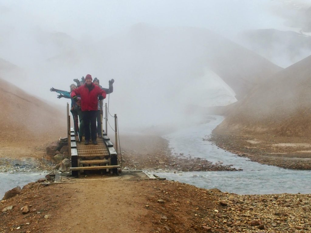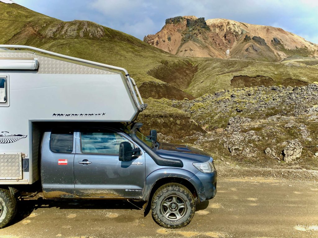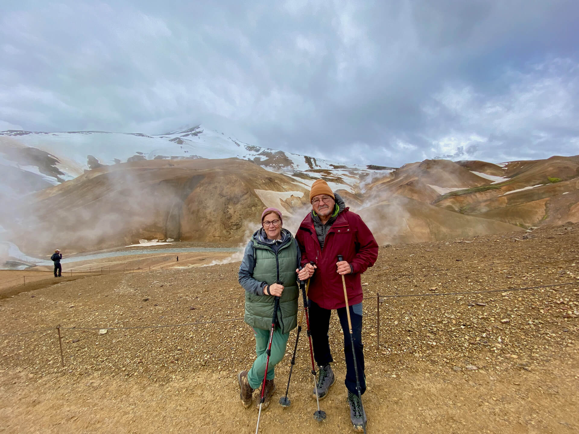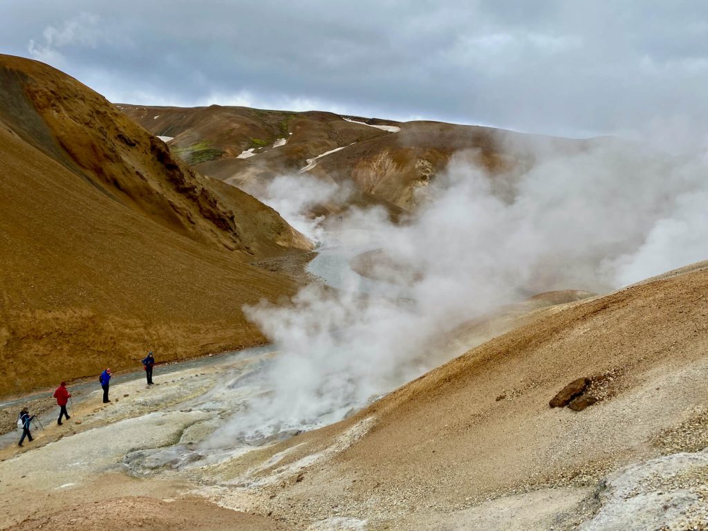 Dennoch sind wir völlig fasziniert von dem Naturschauspiel. Ganz in der Nähe liegt noch ein Geothermalgebiet, die farbenfrohe, faszinierende Vulkanwelt des Kerlingarfjöll. Die ruppige Piste F347 bringt uns bis zum Wanderparkplatz, dort packen wir Schuhe und Stöcke aus, Regenschutz brauchen wir nicht, aber Haube und Handschuhe allemal. Denn – der Wind ist auch schon da!