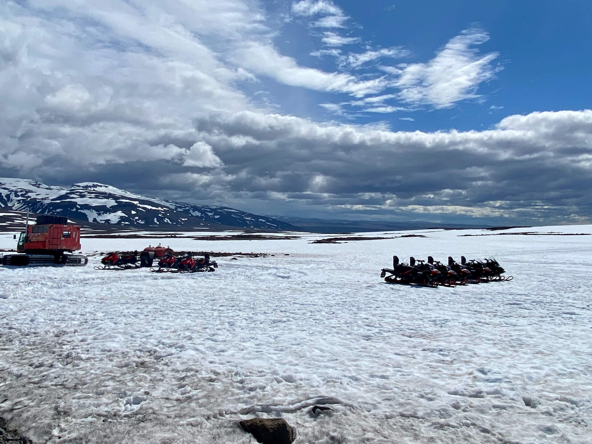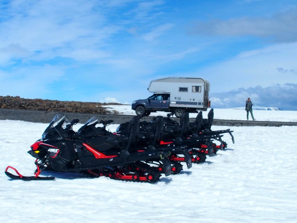 Egal, hier werden die Touristen mit riesigen Hochlandbussen hergebracht, damit sie für gutes Geld mit den Skidoos ein paar Runden am Langjökullgletscher drehen können. Das Spektakel schauen wir uns an und fahren wieder hinunter.