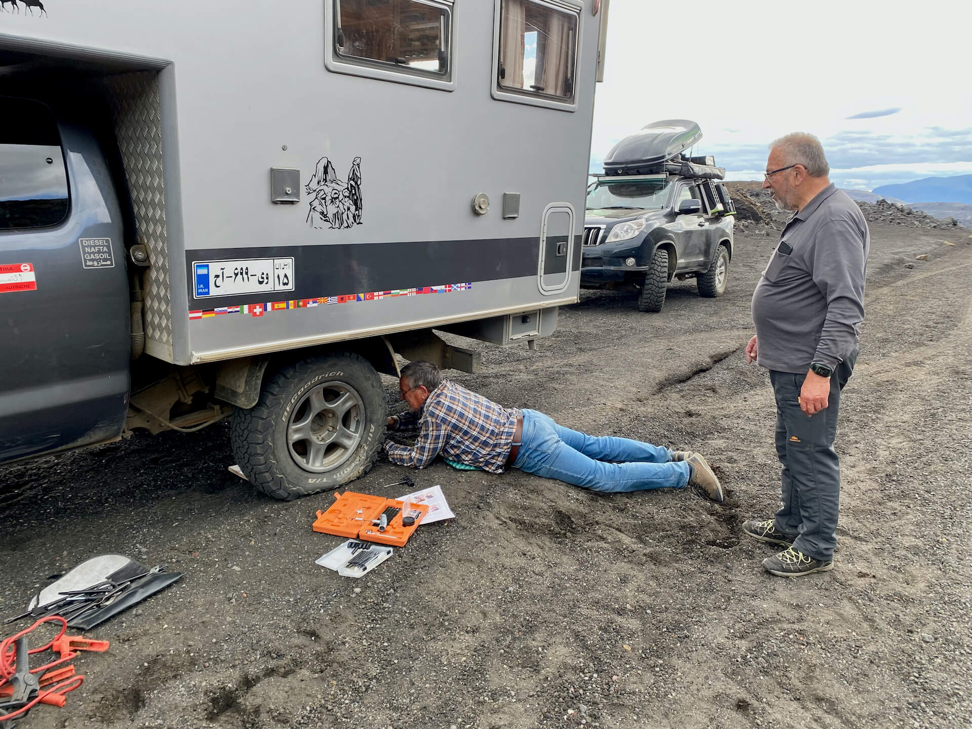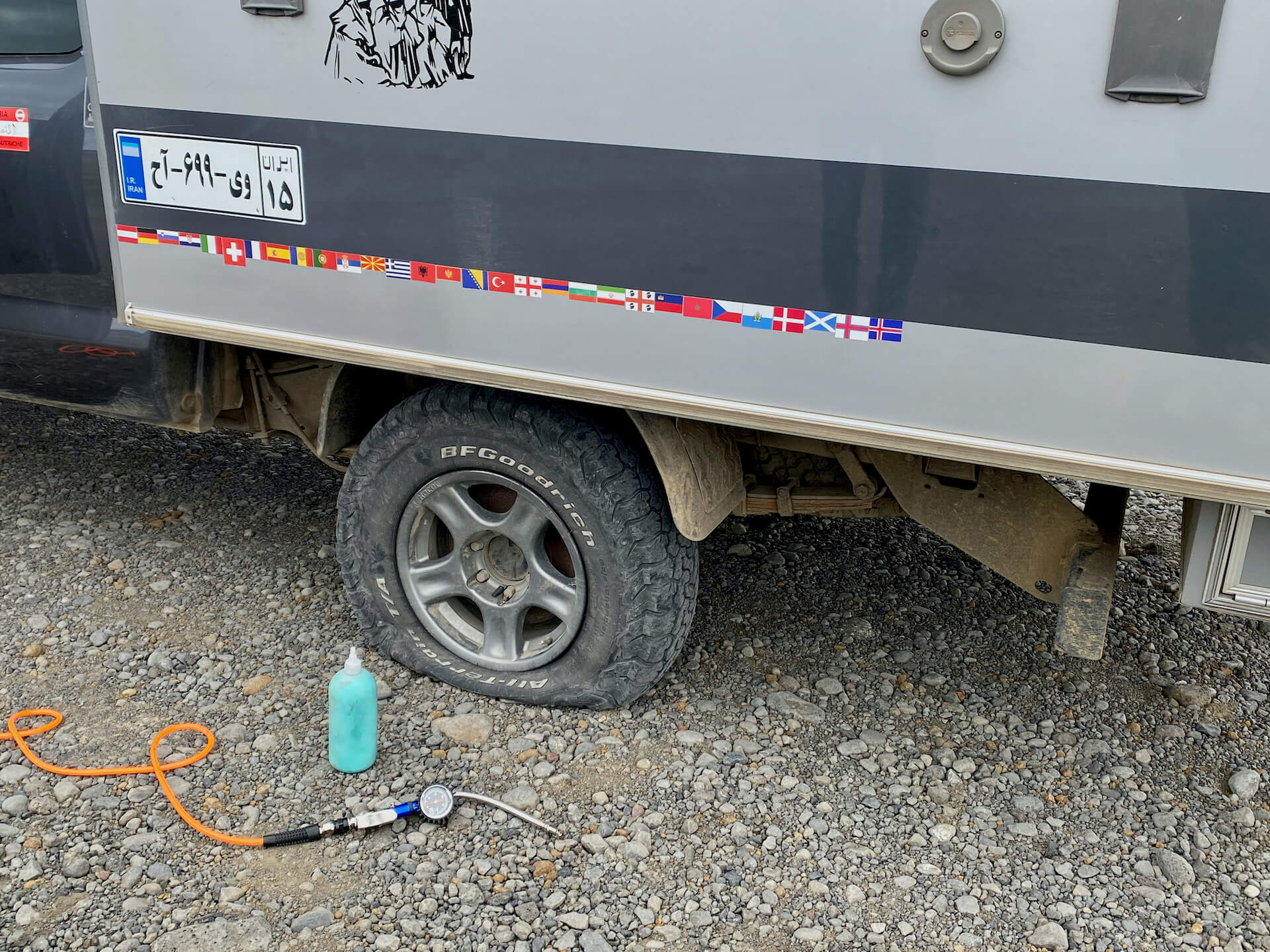 Zuvor strapaziert noch ein Hinterrad mit zuwenig Luft unsere Nerven. Wir versuchen erst mit einem Reifendichtmittel das Problem zu lösen.