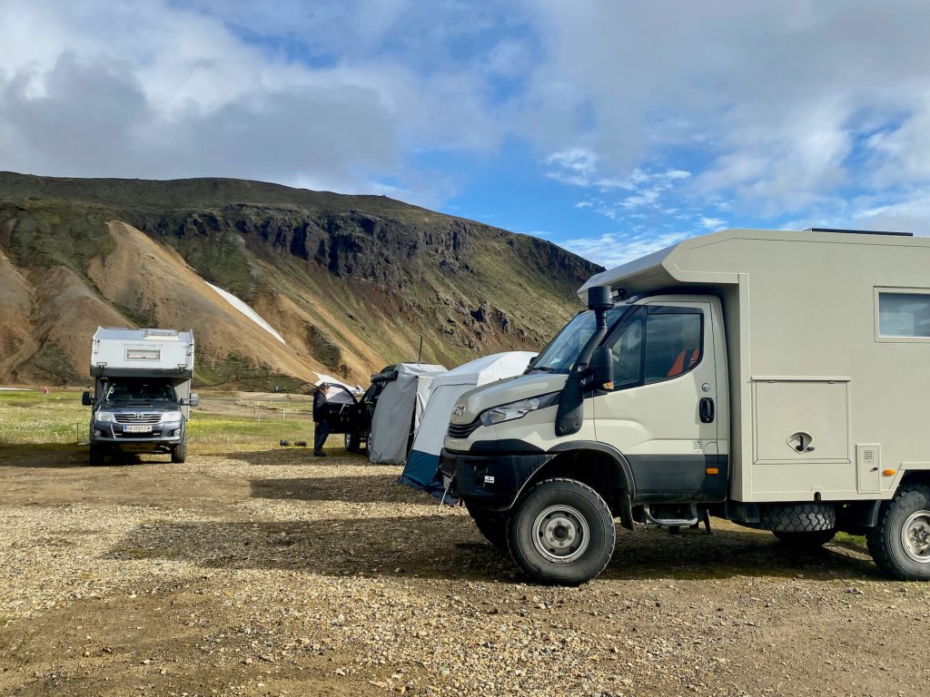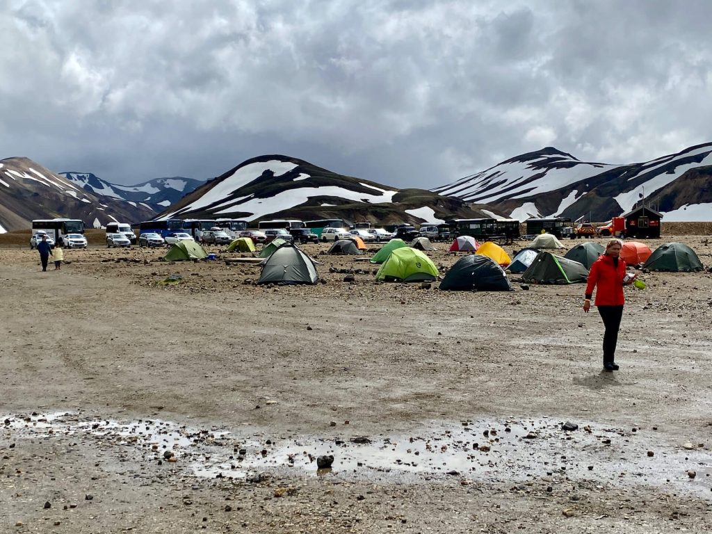 Landmannalaugar wird auch das „Pfadfinderlager Islands“ genannt, sehr viele Junge (und nicht mehr ganz…) kommen mit dem Zelt hierher, entsprechend bunt ist das Bild und das Treiben auf der großen Wiese. Zudem werden unzählige Touri’s mit den Hochlandbussen hierhergekarrt, hauptsächlich Amerikaner (ja, auch die wollen einmal da gewesen sein – für uns reicht es sicherlich das eine Mal!) da stoßen die sanitären Einrichtungen bald an ihre Grenzen. Wie schön, wenn man autark ist.