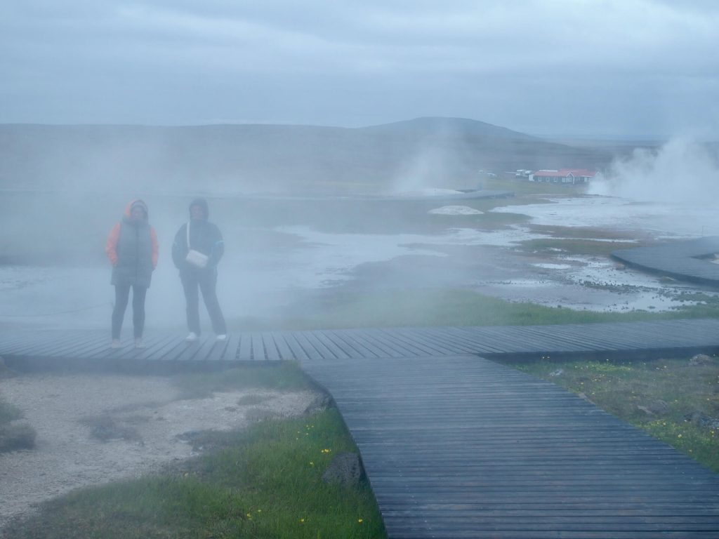 Hier ist schon mächtig was los, viele Gruppen mit Zelten und auch einige Camper sind schon da. Der Wind auch. Und zwar stürmisch und eiskalt! Da kommen die stinkenden, heißen Rauschwaden genau recht, wir begnügen uns damit, denn der Hot Pot ist mit Jugendgruppen besetzt. Da gehören wir nun wirklich nicht mehr dazu.