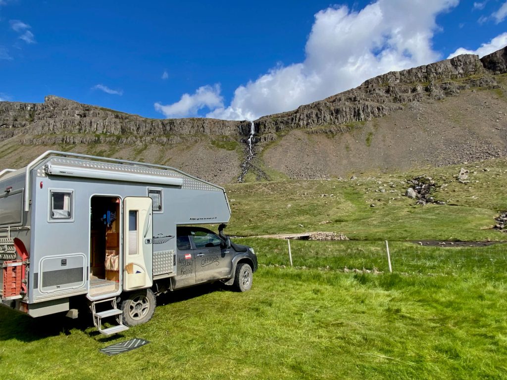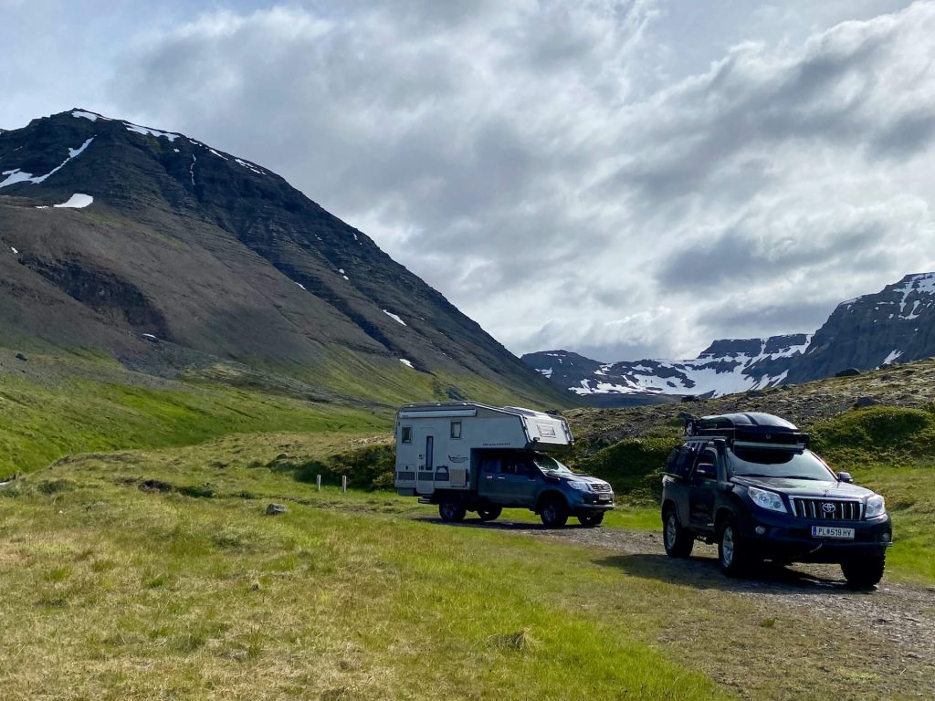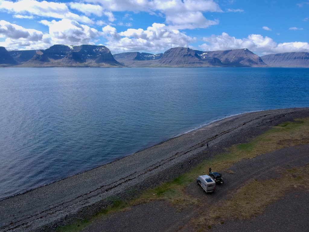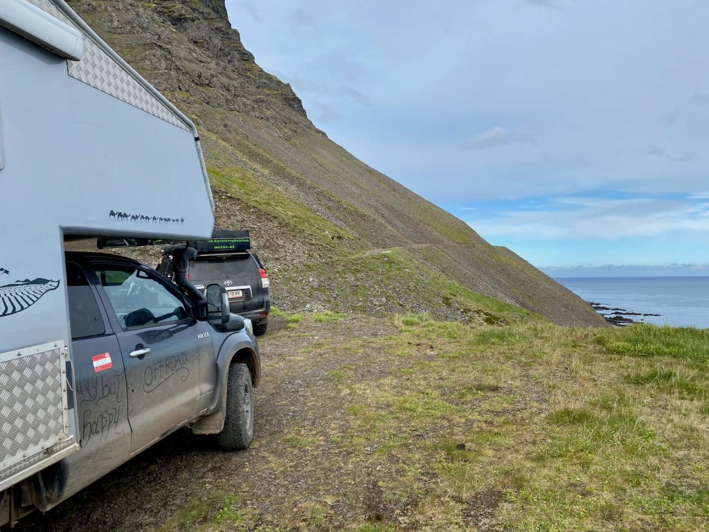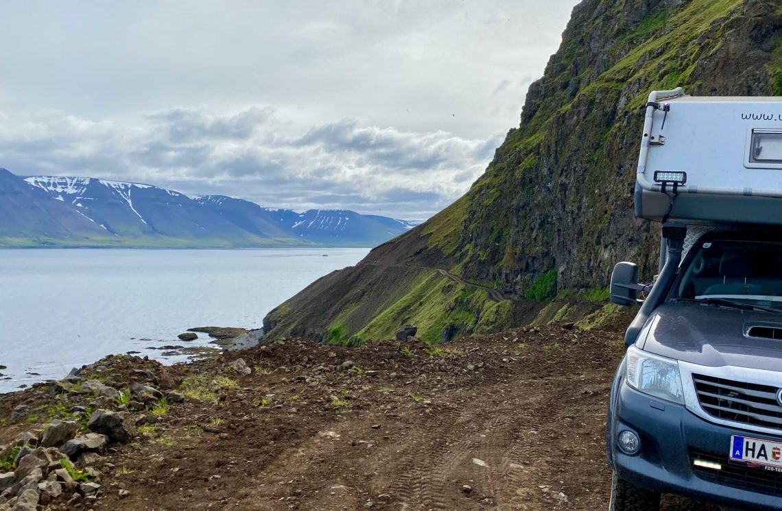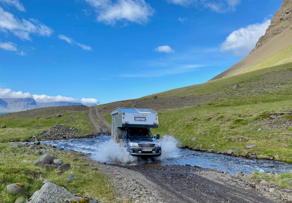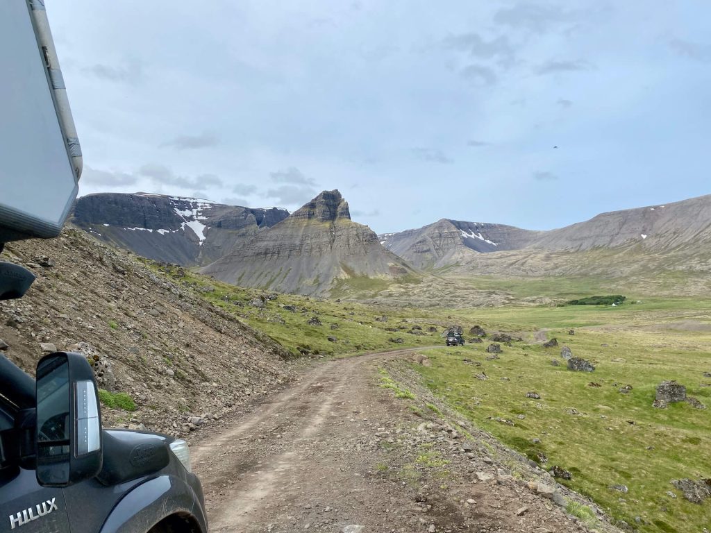 Die Westfjorde waren immer schon unser Traumziel auf Island. Wenig Touristen, einsame Pisten und tiefe Fjorde erwarten uns. Wir haben ambitionierte Ziele dort. Allem voran die Route 622 von Þingeyri nach Auðkúla. Sie hat einige Herausforderungen für WoKi und Driver. Natürlich auch für die Navigatorin, aber die hat hier eigentlich nichts zu tun, außer Fotos zu schießen und „ohh mein Gott, oder du lieber Himmel“ zu sagen. Aber auch: „Wahnsinn, ist das geil hier!“ – eigentlich nicht so mein Wortschatz, aber außergewöhnliche Situationen brauchen auch außergewöhnliche Ausdrucksmittel!