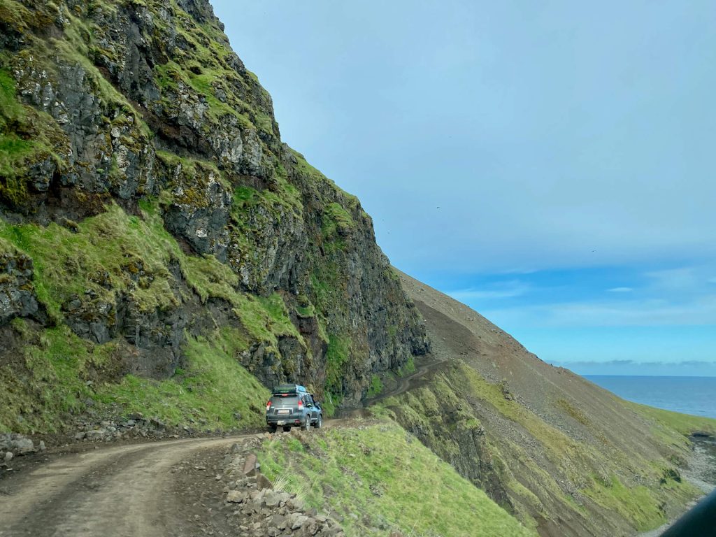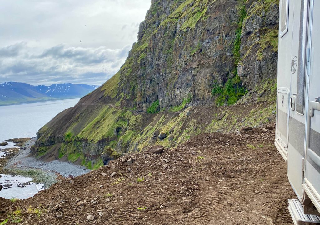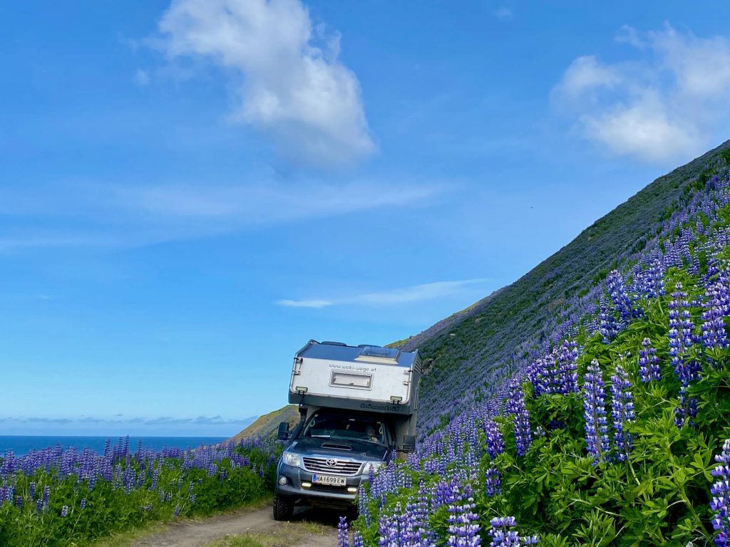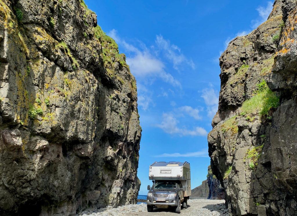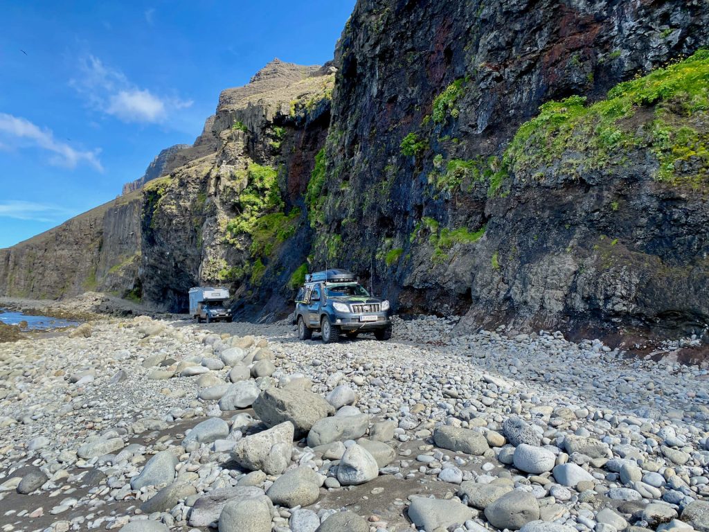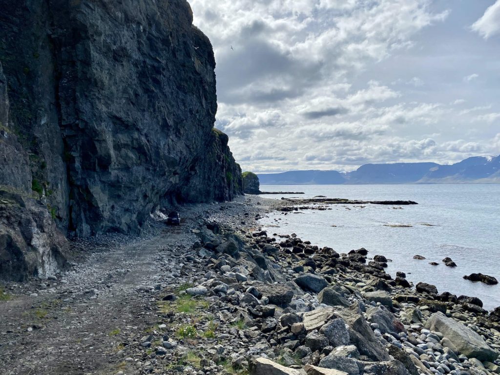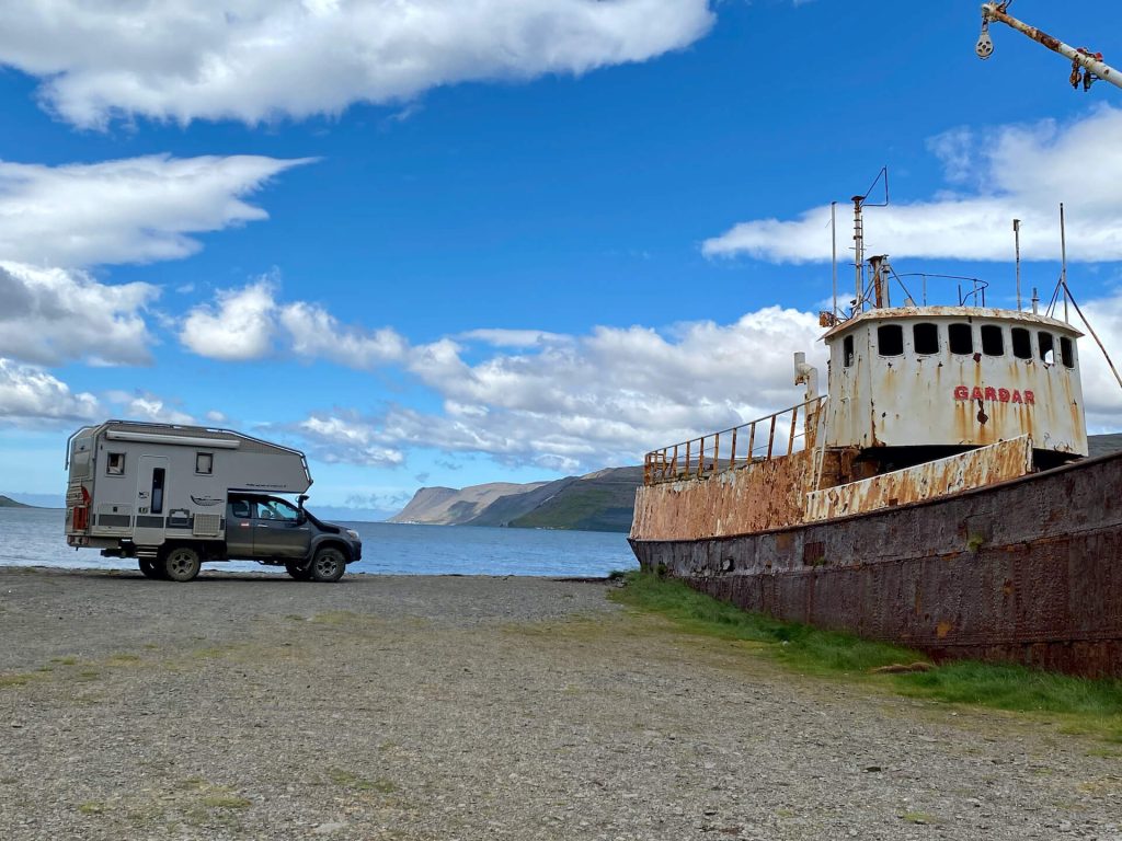 Die Westfjorde waren immer schon unser Traumziel auf Island. Wenig Touristen, einsame Pisten und tiefe Fjorde erwarten uns. Wir haben ambitionierte Ziele dort. Allem voran die Route 622 von Þingeyri nach Auðkúla. Sie hat einige Herausforderungen für WoKi und Driver. Natürlich auch für die Navigatorin, aber die hat hier eigentlich nichts zu tun, außer Fotos zu schießen und „ohh mein Gott, oder du lieber Himmel“ zu sagen. Aber auch: „Wahnsinn, ist das geil hier!“ – eigentlich nicht so mein Wortschatz, aber außergewöhnliche Situationen brauchen auch außergewöhnliche Ausdrucksmittel!