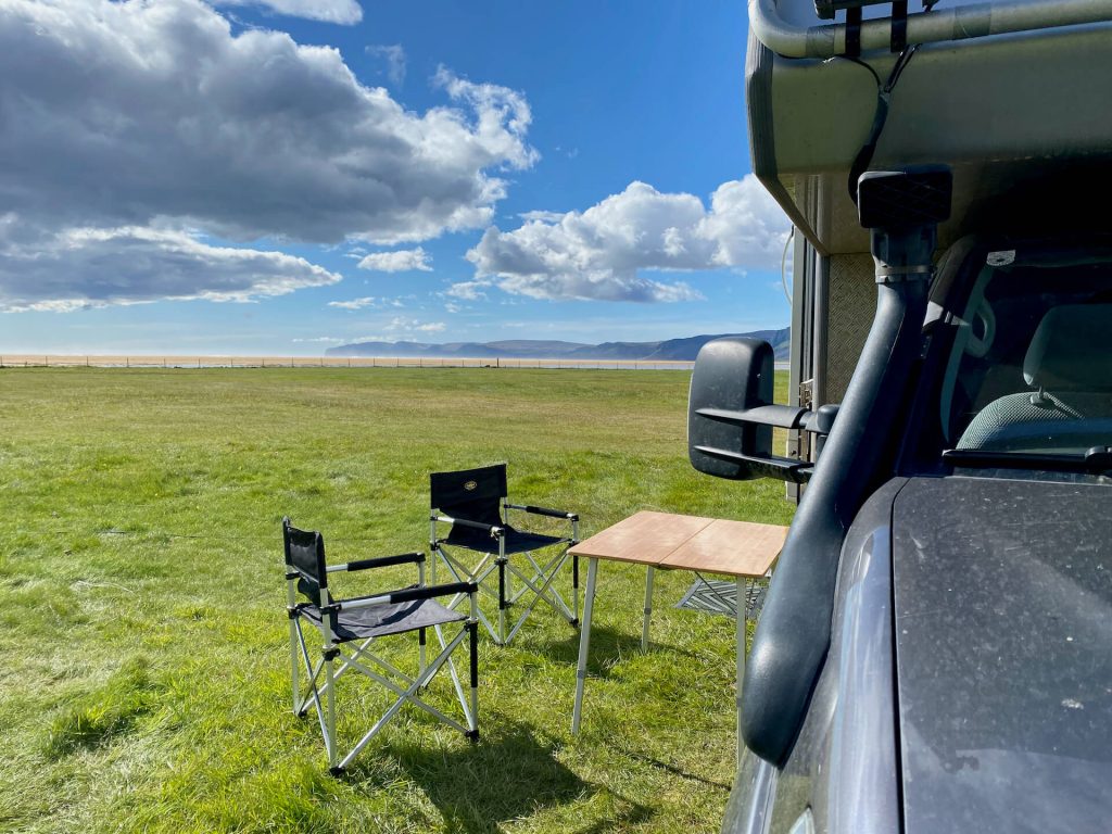 Hier ist ein „Campingplatz“ jedenfalls bietet uns der freundliche Isländer eine windgeschütze Bleibe auf der Wiese vor einem Guesthouse mit Aufenthaltssraum und Kochgelegenheit. Das ist gut, wir bleiben und beschließen, den Hot Pot morgen zu besuchen. Immer in der Hoffnung, dass sich das Wetter beruhigt.