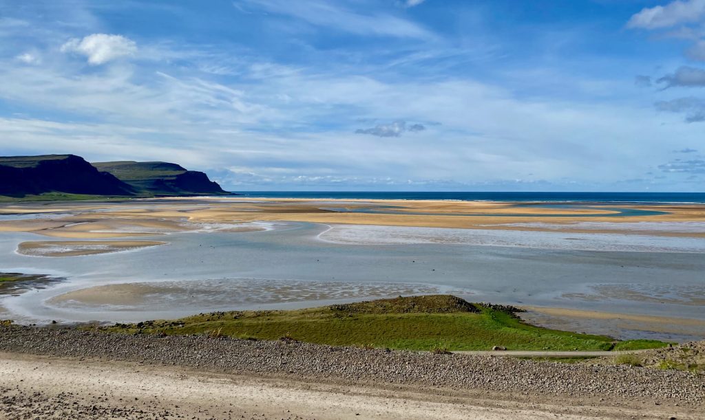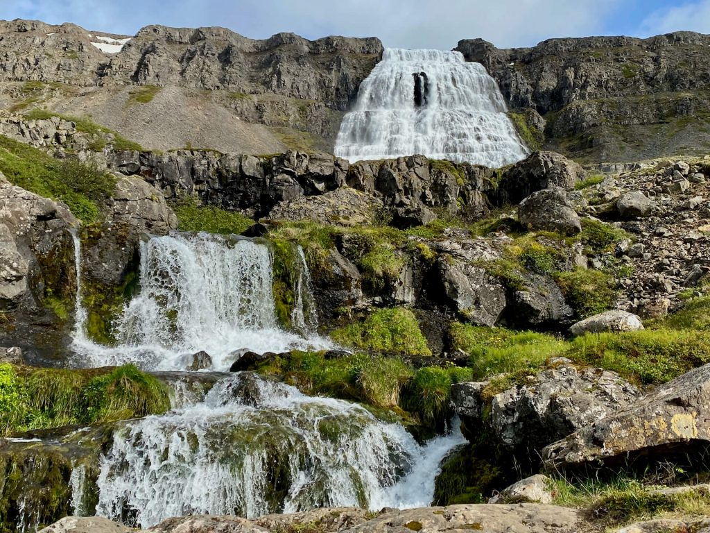 Von hier geht es durch wunderschöne Landschaften, die wir zwar im Sonnenlicht aber doch lieber im geschützten Auto bestaunen. Wo geht’s hin? Na klar, schon lange keinen Wasserfall gesehen und diesen hier bezeichnen viele als den Schönsten: der Dynjandifoss.