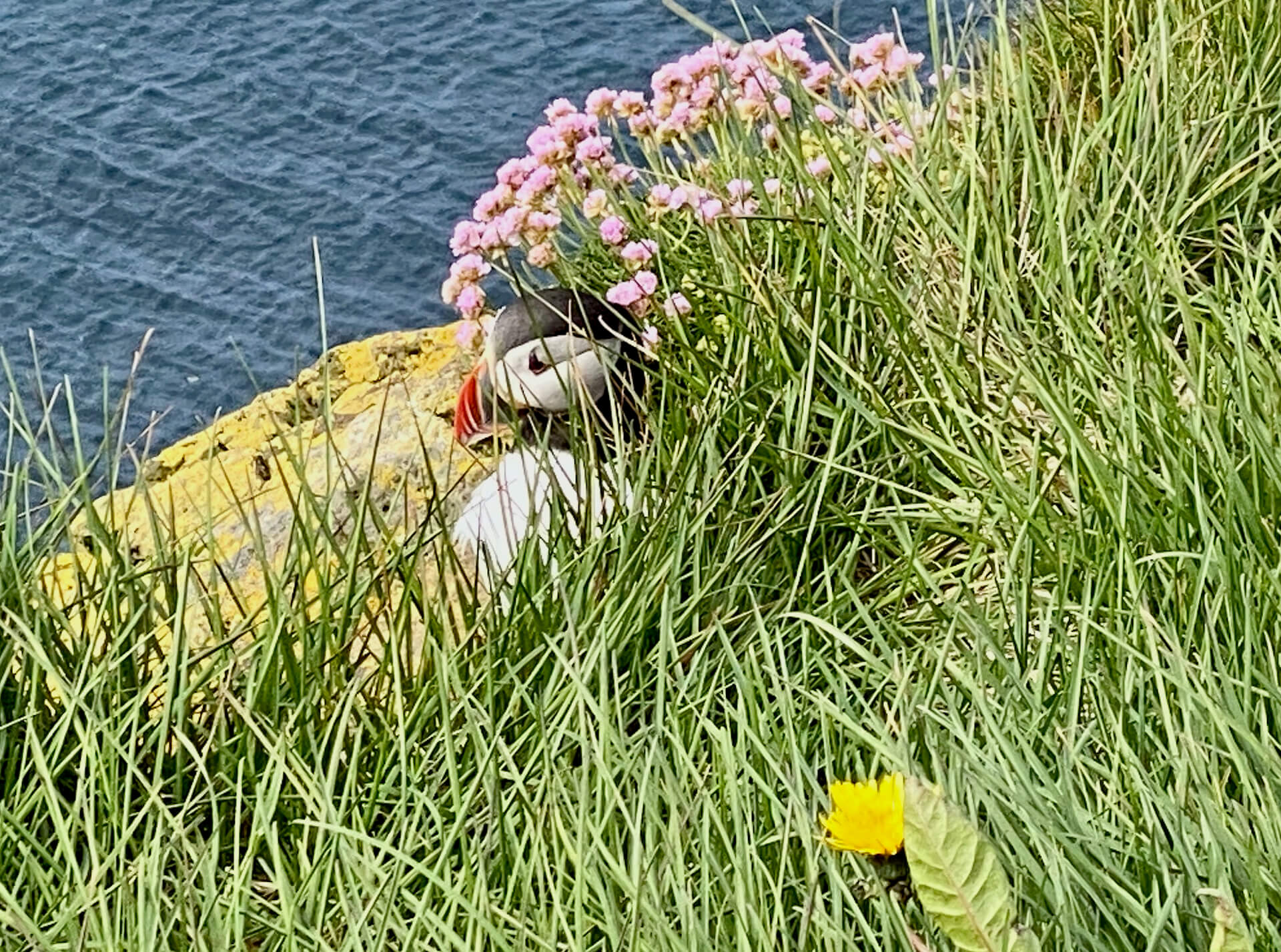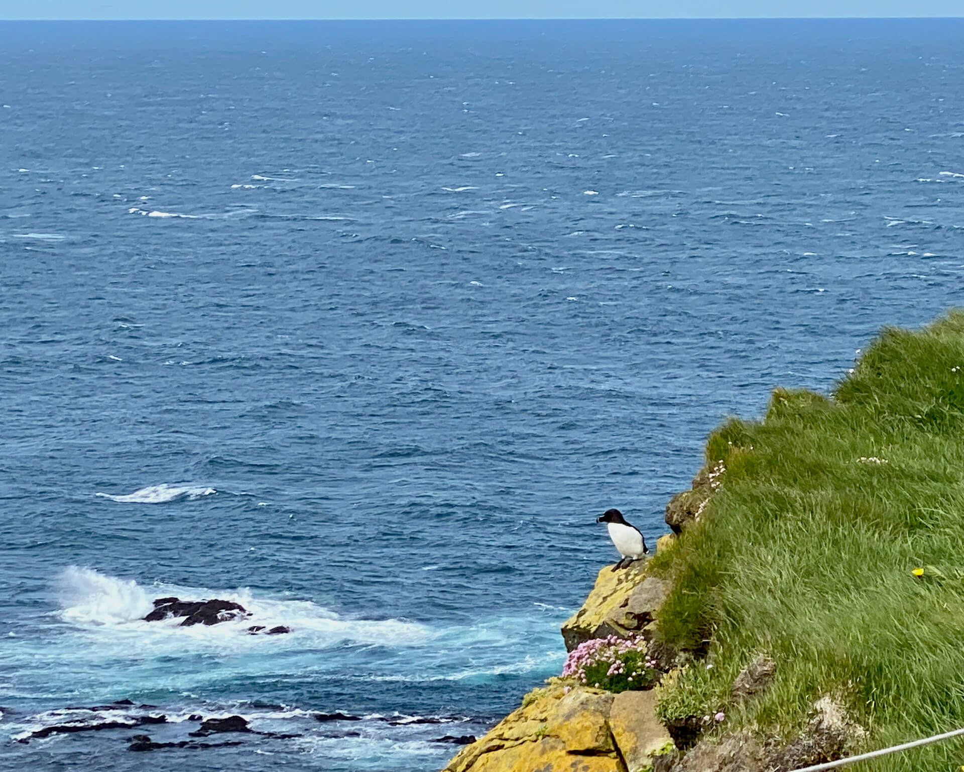 Unseren hartnäckigen Begleiter, den Wind bzw. Sturm, können wir immer noch nicht abschütteln, wir kämpfen uns trotzdem hinauf bis zur Plattform des Vogelfelsens, aber es war nur ein einziger Puffin zu sehen, der sich im Gras ein wenig versteckt hat bzw. Schutz gesucht hat. Wie gut, dass wir auf den Färöer Inseln schon so viele von den putzigen Kerlchen beobachten konnten.