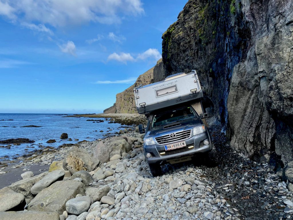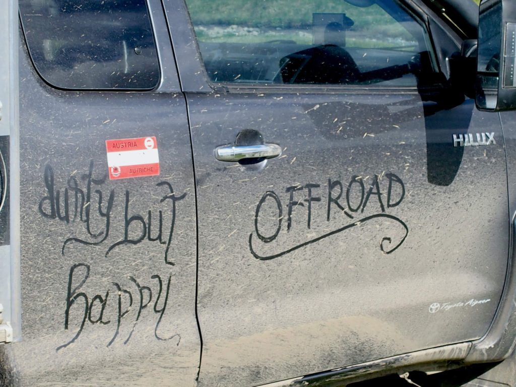 Die großen Kieselsteine rutschen unter unserem Gewicht weg, die Schräglage ist – jedenfalls für mich von außen gesehen – ziemlich beängstigend, aber Toyo und Driver geben ihr Bestes. Im Gegensatz zu mir, ich kann vor lauter Schreck nicht einmal die Kamera ruhig halten. Fazit: es gibt kein einziges Bild von der „Schlüsselstelle“! Ich hab ja nie behauptet, ich hätte Nerven wie Drahtseile, aber hilfreich wären sie jetzt schon gewesen 🙂