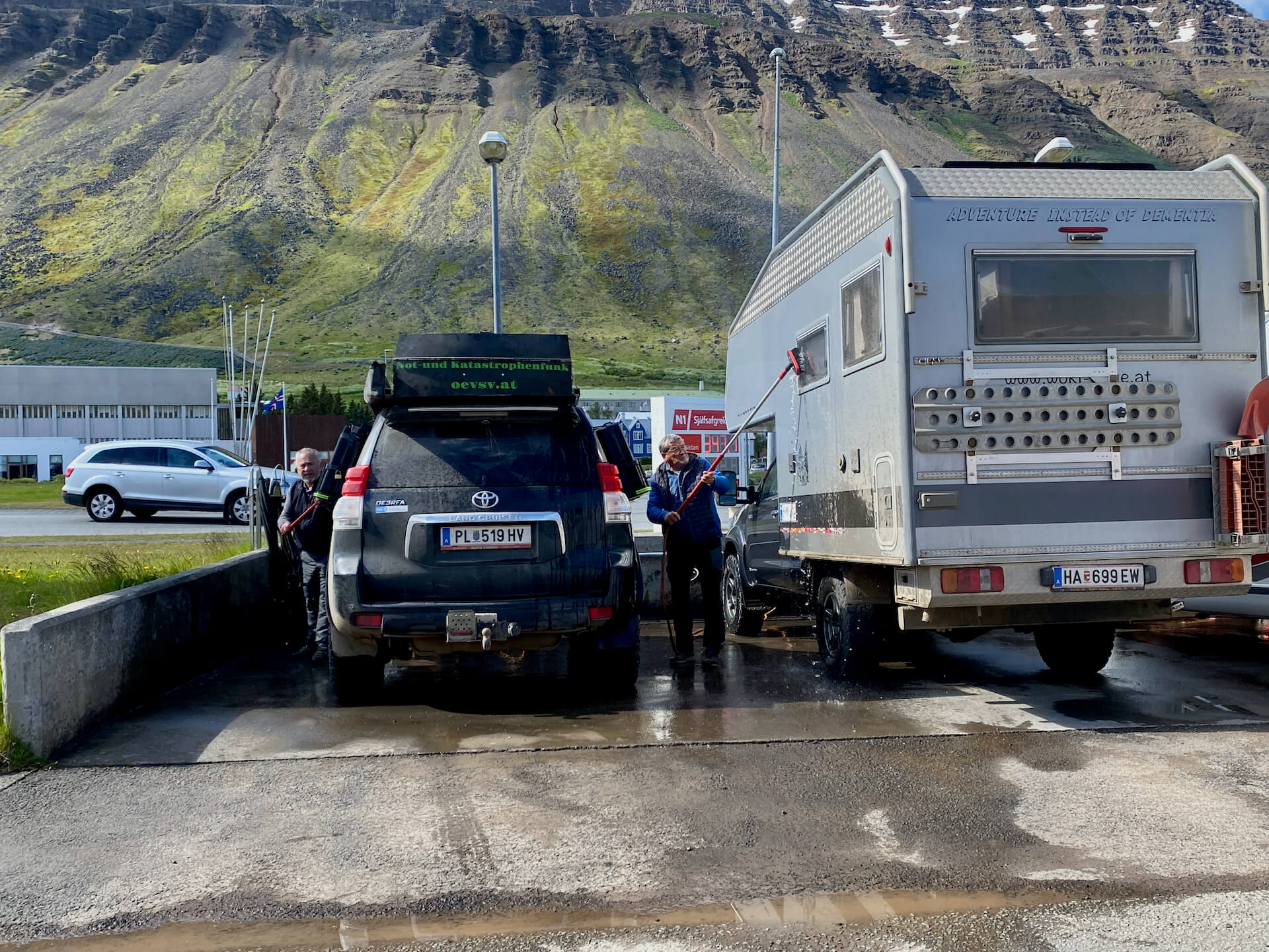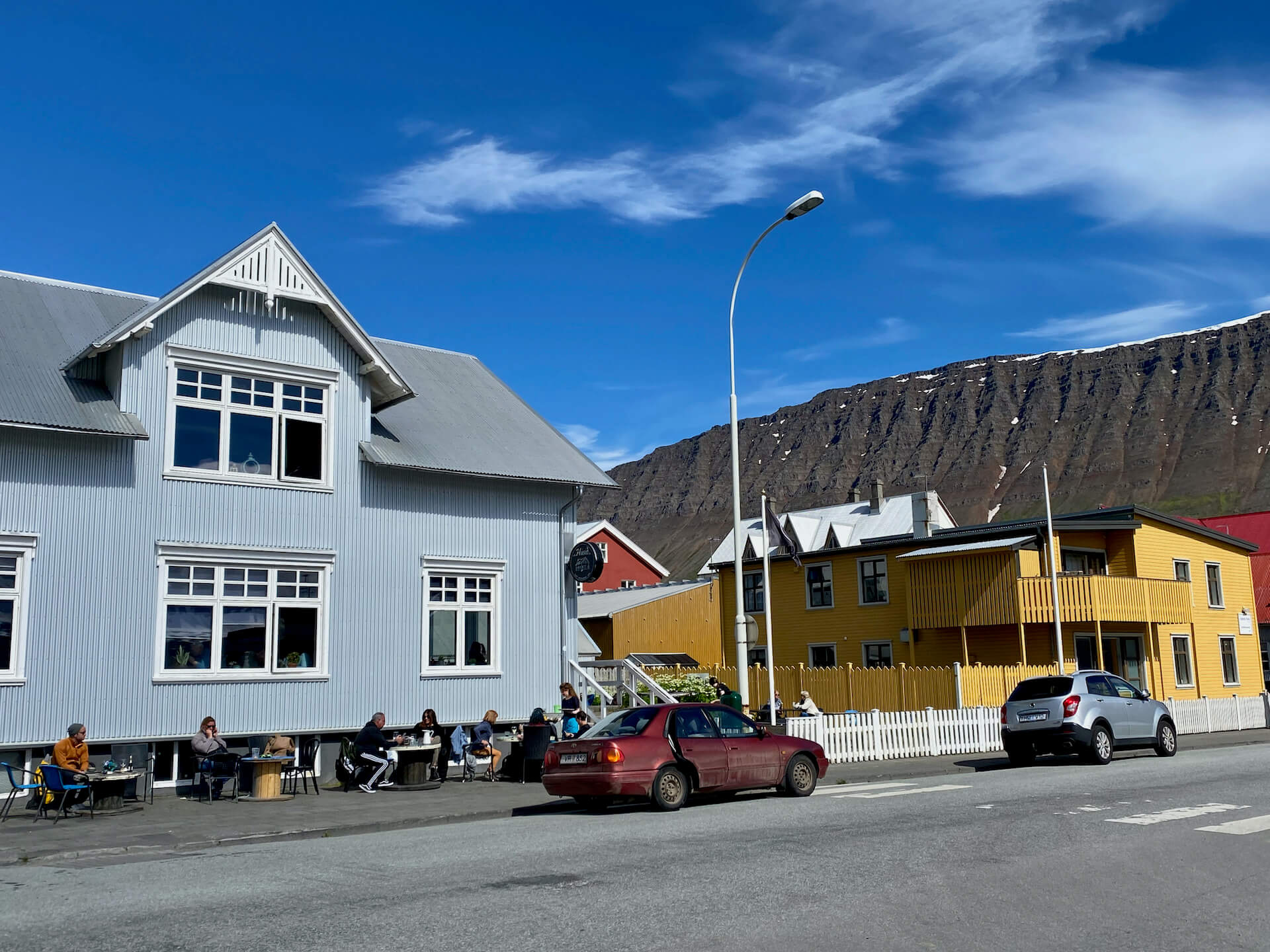 Bis Isafjörður reicht unser Elan noch. Erst den ärgsten Dreck von den Kisten waschen, dann setzen wir uns bei einem netten Kaffi in die Sonne.