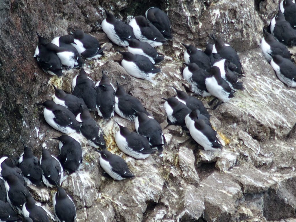 Die Trottellummen brüten hier eng angeschmiegt an den Felsen und es nimmt mich wunder, dass sie nicht der Sturm samt Nest und Eier hinunterwachelt.