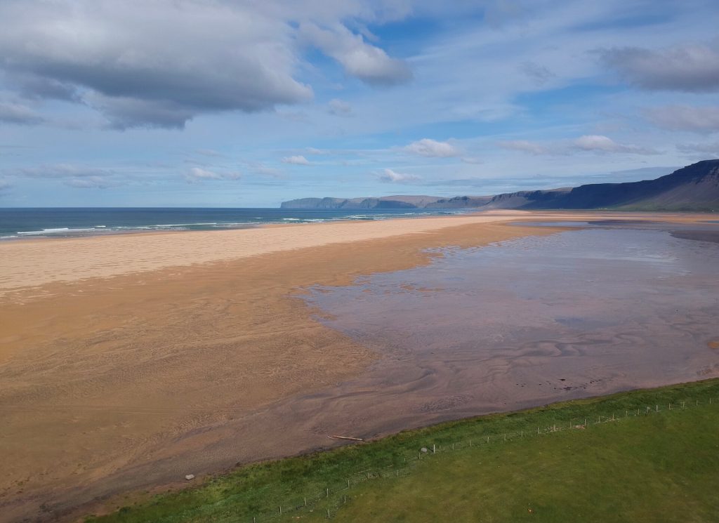 Bevor wir uns ins Abenteuer stürzen, wollen wir die süd-westlichste Halbinsel der Westfjorde bereisen. Rauðasandur ist der bekannte rote Sandstrand. Látrabjarg, der Vogelfelsen, zeigt uns hoffentlich einige Puffins, hier ist angeblich die größte Brutkolonie auf Island. Die Holperpiste führt uns hinab zum schönen Strand. Schon von oben können wir die rote Färbung des Sandes sehen und sind ganz fasziniert von der neuen Kulisse, die uns hier geboten wird.